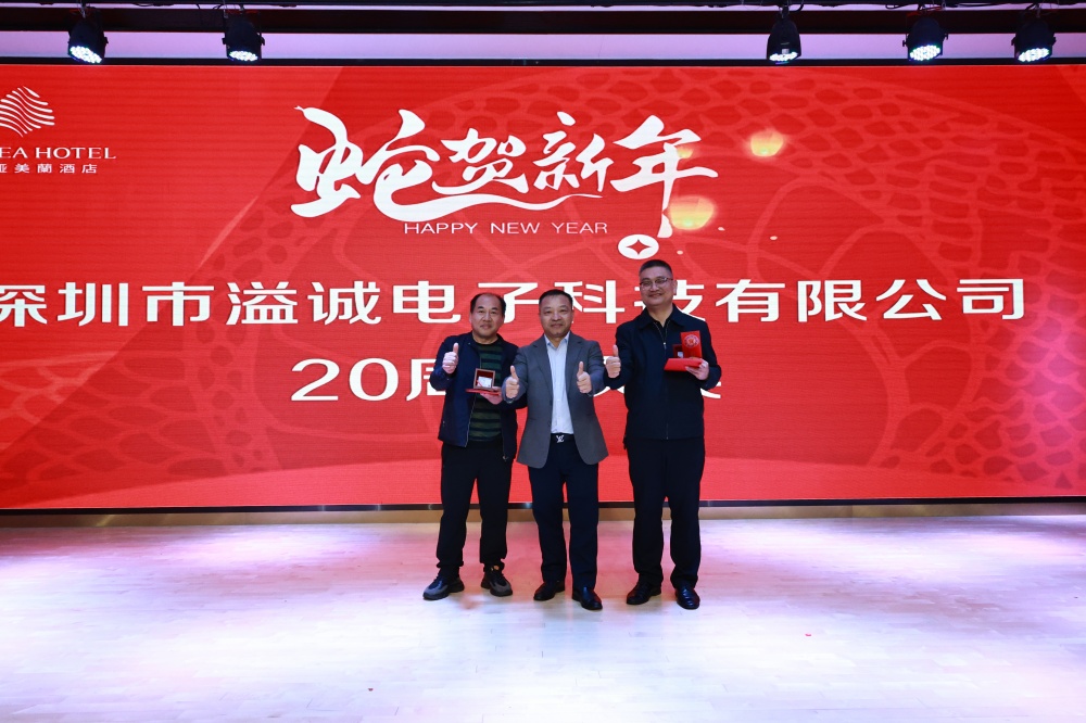 2025 年 1 月 5 日,深圳市溢诚电子科技有限公司尾牙年会盛大举行,这场凝聚着企业温情与活力的盛会,汇聚了全体员工的欢声笑语,上演了一幕幕精彩瞬间,不仅有精彩纷呈的文艺表演,更有对优秀员工的表彰与对老员工的感恩致敬。 晚会于 17:30 拉开帷幕,首先进行的是 30 分钟的迎宾签到环节,员工们陆续到场,期待着这场属于大家的年度盛宴。18:00,一曲激昂的开场鼓舞正式点燃了现场气氛,表演者们用铿锵有力的鼓点,展现出溢诚电子蓬勃向上的精神风貌。